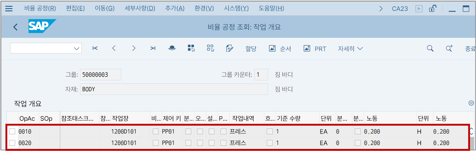 위 제품은 라우팅 내 작업 10(프레스 1)과 작업 20(프레스 2)으로 구성되어 있다. 만약에 해당 제품의 작업 확정을 10번 작업에 대해서만 수행하고 이번 달이 종료되었다면? 바로 이런 경우에 결산 시 재공품으로 계산하게 된다.