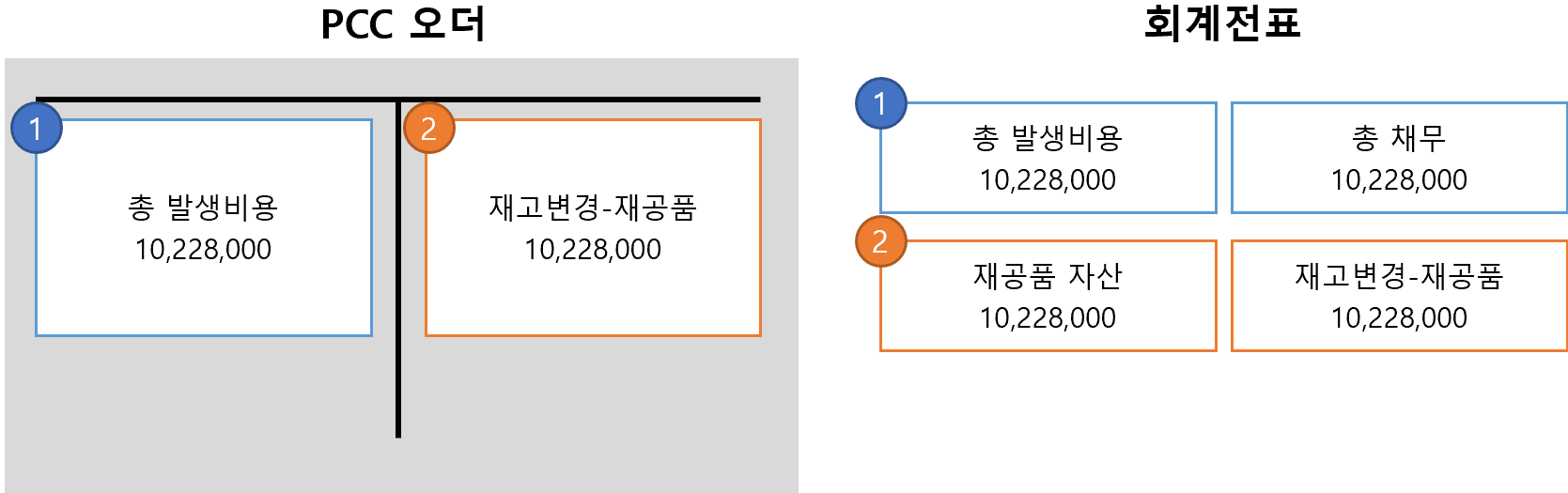 왜 차이 금액이 발생했는지 이걸 보면 알 수 있다. 오더 차변에 쌓인 금액은 10,228,000원이었는데 이 중 재공품으로 자산화된 금액이 10,344,257원으로 더 컸다. 위에서 봤던 산식을 기억하는가?