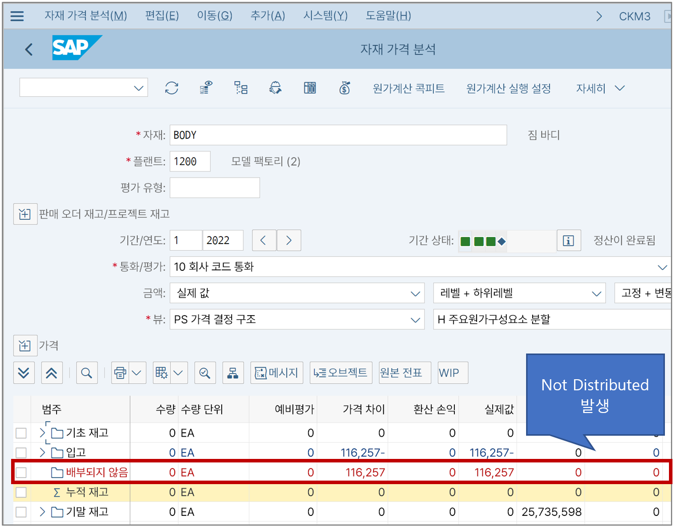 이전 글에서 '배부하지 않음'이 발생했을 때 T-CODE: CKMLCP에서 '재고범위 점검 안 함'에 체크해서 해당 금액을 누적재고에 모두 반영할 수 있었다. 또는 그냥 그대로 두거나 다른 계정으로 대체하는 방식으로 전액 당기 비용 처리할 수 있었다.