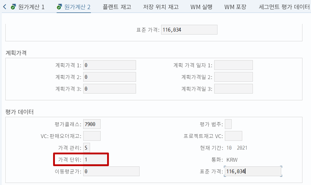 위 그림을 보면 자재 마스터에서 가격 단위란 필드와 원가계산 로트크기라는 필드를 각각 확인할 수 있다. 일단 답부터 말해보자면