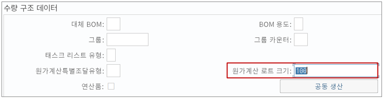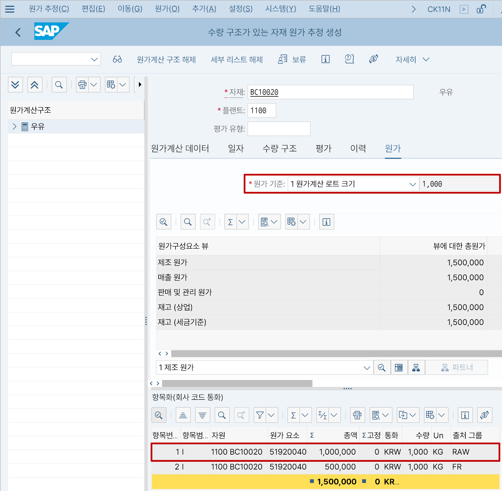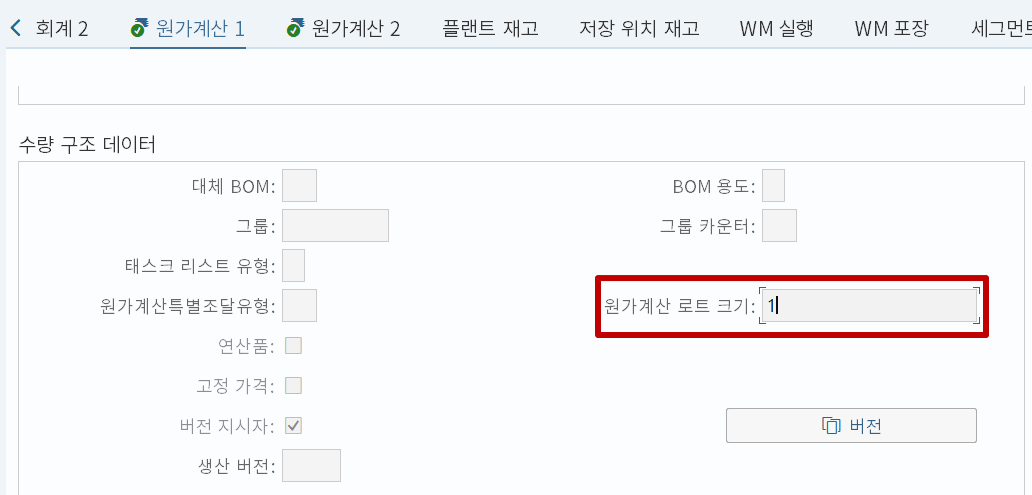 직접 시스템을 통해 테스트를 해보자. 위 그림에서처럼 원가계산 로트크기가 '1'인 상황을 가정해본다.