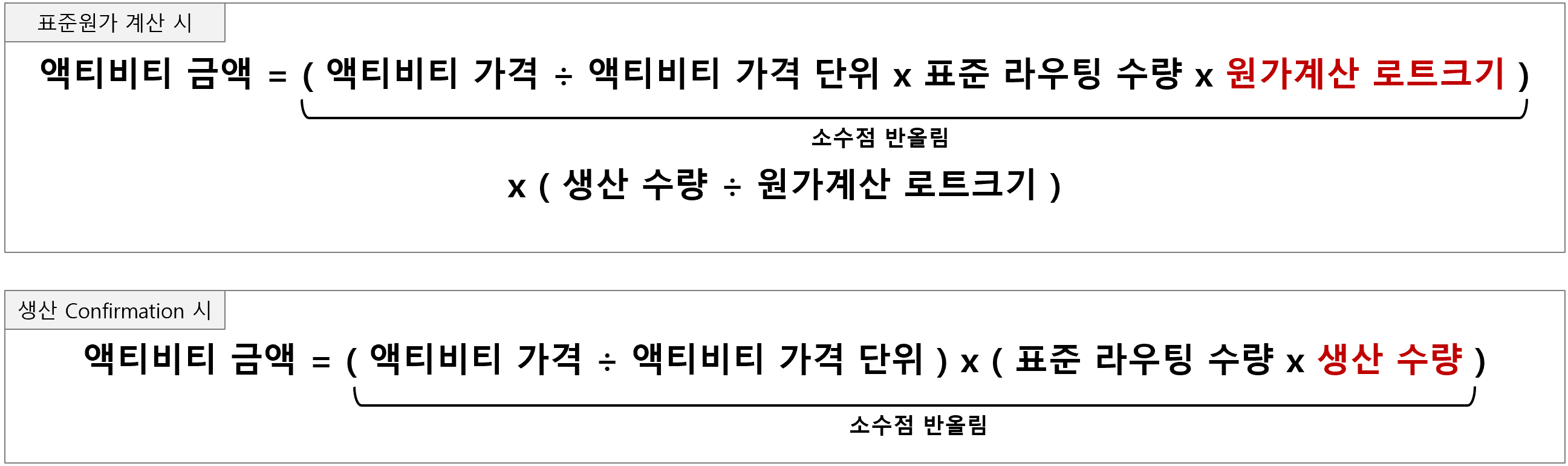 위 그림을 잘 보면 반올림이 들어가는 산식에 값이 다른 건 둘 뿐이다. 원가계산 로트크기와 생산수량이다. 즉 이 둘의 자릿수만 맞추면 모든 게 해결된다. 비록 원가계산 로트크기가 액티비티 가격단위나 라우팅 수량보다 작은 자릿수를 써서 단수가 발생한다 하더라도, 생산 Confrimation 시에도 동일한 단수가 발생하기 때문에 둘 사이에 차이는 사라지게 된다.