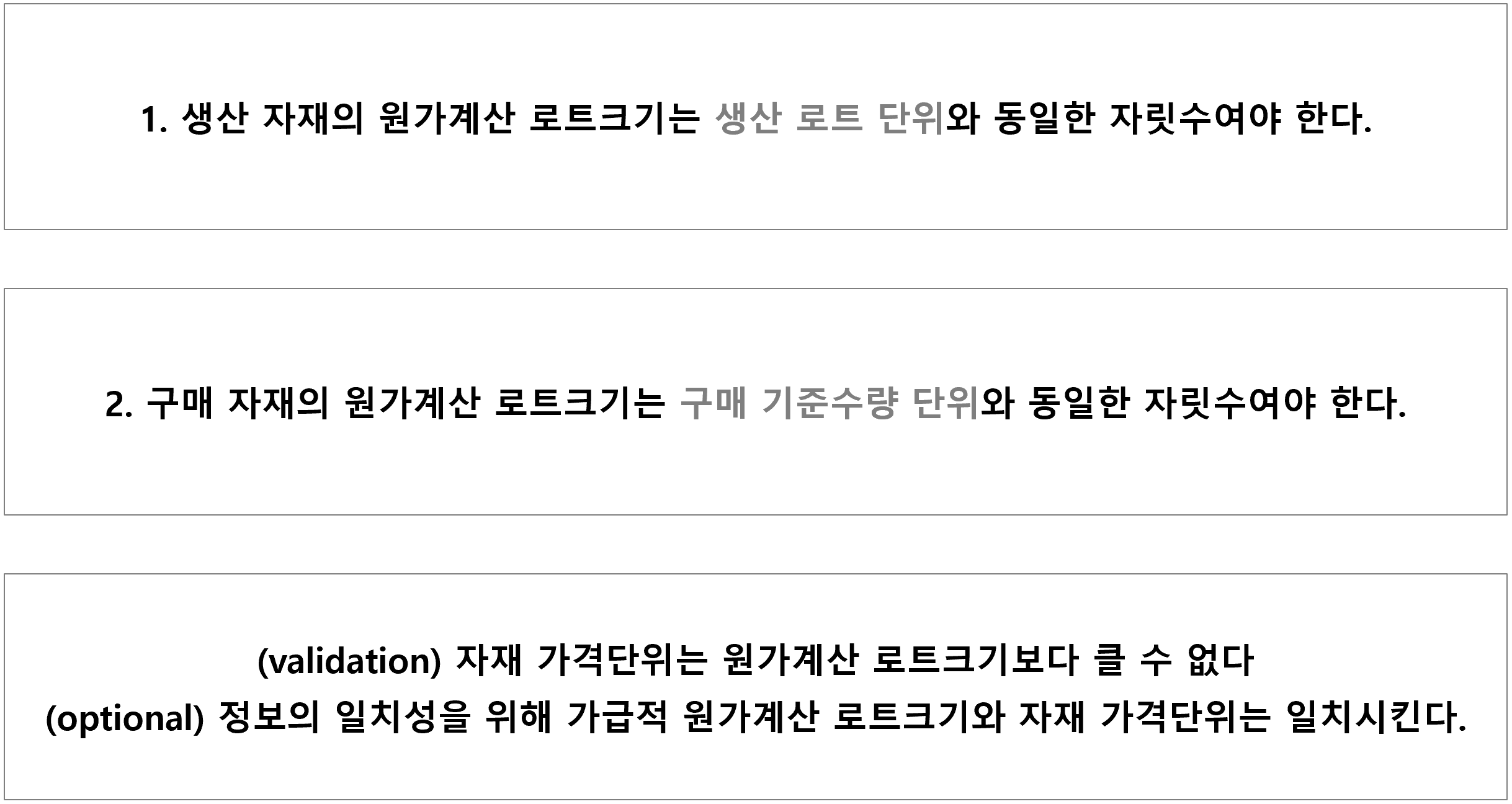 2. 구매자재의 원가계산 로트크기는 [ 구매 기준수량 단위 ]와 동일한 자릿수여야 한다.