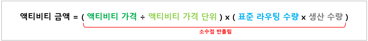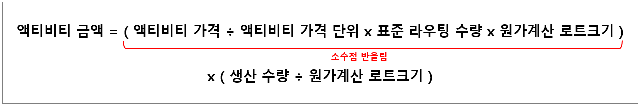 즉 월중 액티비티 금액이 들어올 때는 원가계산 로트크기는 안 쓴단 의미다. 이제 서두에서 말했던 "원가계산 로트크기는 원가 '추정' 시 사용되는 단위"라는 말의 뜻이 이해되는가? 원가계산 로트크기는 사전원가 추정 시에는 사용되지만, 실제원가 계산 시에는 사용되지 않는다.