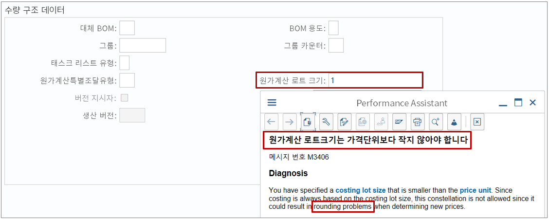 일반적으로 원가계산 로트크기를 큰 숫자로 해야 단수 차이가 줄어든다고들 한다. 운영이나 프로젝트 시에는 가격단위와 원가계산 로트크기를 항상 같은 숫자로 지정하도록 룰을 정하는 경우도 많다.