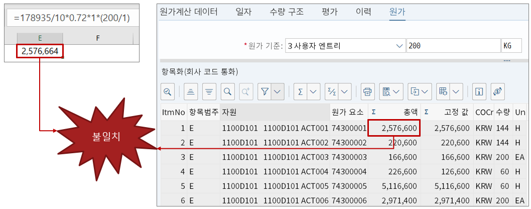 위 그림처럼 거래의 실질상 해당 100개당 가격으로 구매하도록 되어 있다면? 이런 경우라면 원가계산 로트크기를 1개로 했을 때 반올림되어 500,078 ÷ 100 = 5,001이 되어버린다.