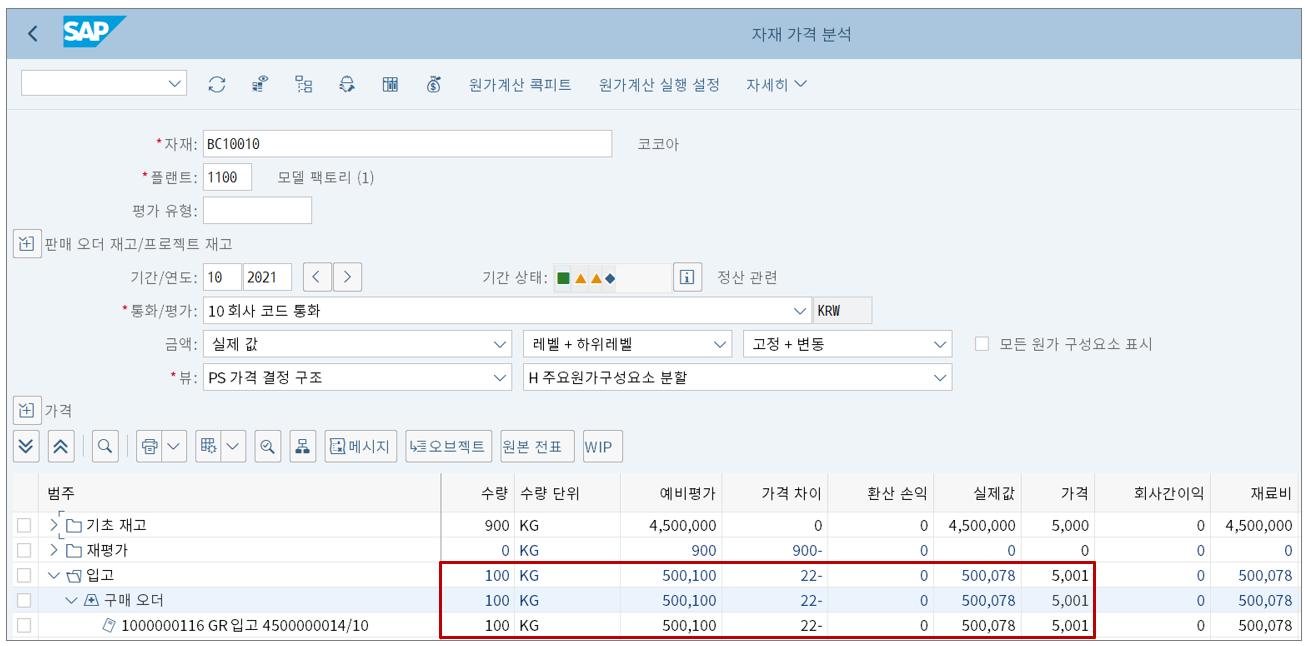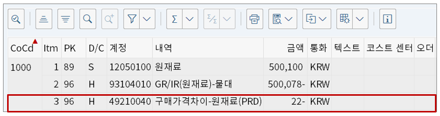 따라서 이대로 입고하면 잘못된 가격단위/로트크기 때문에 차이금액이 발생한다. 위 그림에서 보는 것처럼 100개를 입고했는데 예비평가와 실제값 간의 차이로 22원이 발생했다.