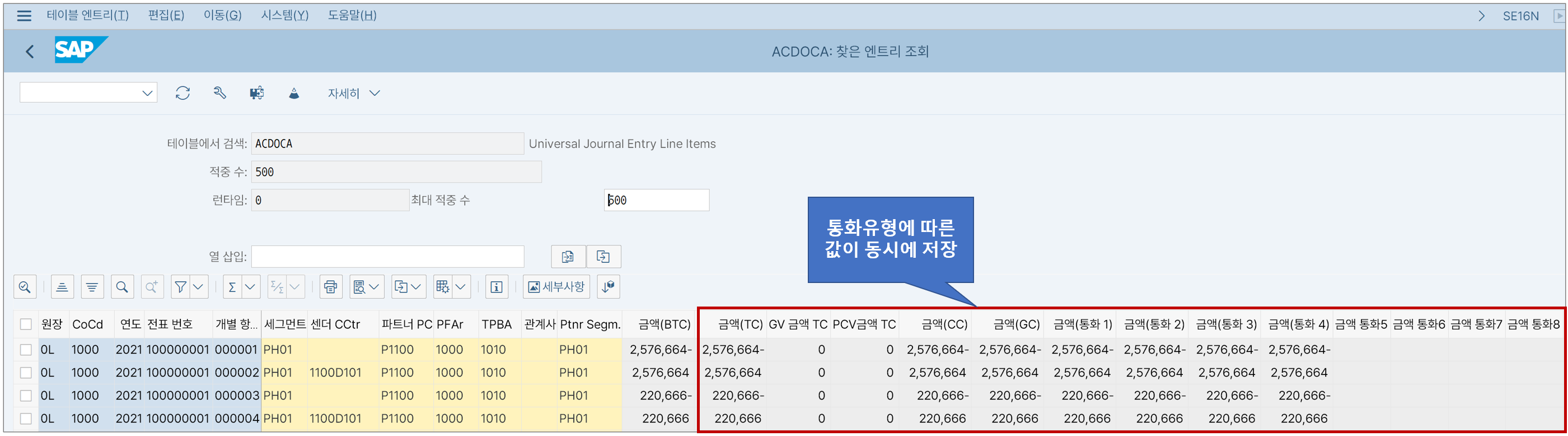 실제 통합원장 테이블인 ACDOCA의 내용을 조회해보자. 위 그림처럼 하나의 거래가 여러 통화로 기표됨을 볼 수 있다. 우리가 설정한 대로 거래통화, 현지통화, 글로벌통화, 자유정의 통화1~4까지만 값이 들어와 있다.