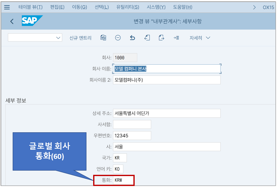 | 60 | 글로벌 회사 통화 | 연결 목적 등으로 설정한 통화 | Company(회사코드와 다름) |