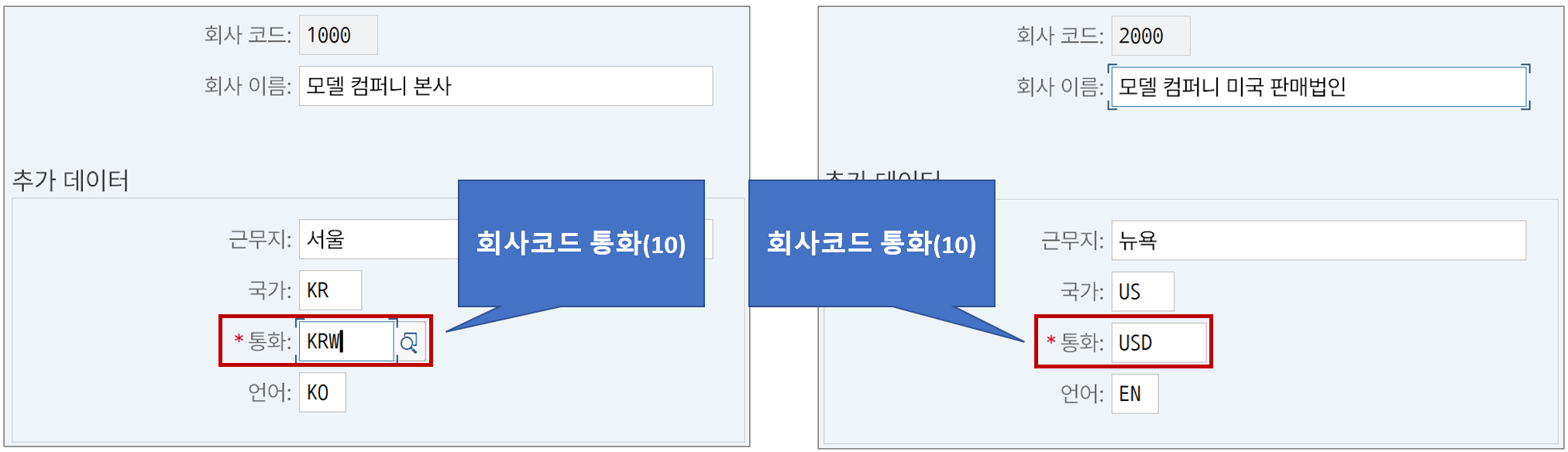 | 10 | 회사코드 통화 | 재무제표, 재무결산용 | 회사코드 |