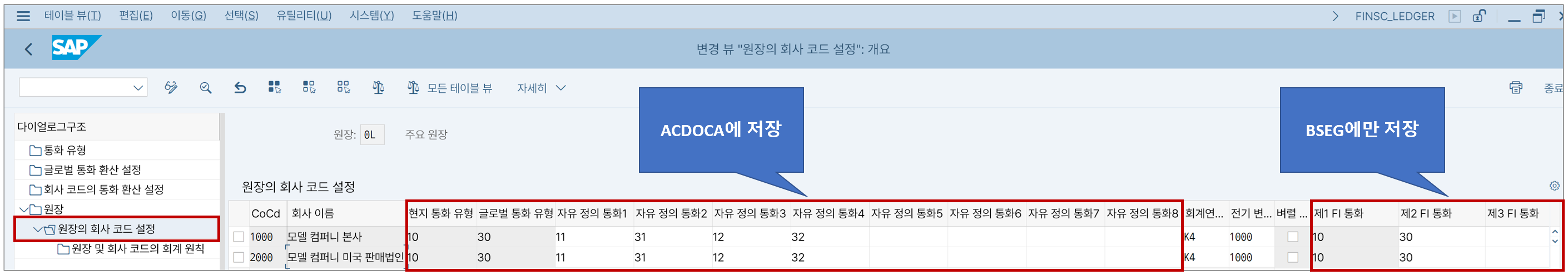 그리고 오른쪽 끝에는 제1 FI통화, 제2 FI통화, 제3 FI통화란 게 있는데 이것은 통합원장 이전 과거 테이블인 BSEG에서만 저장되는 통화유형이다. 이제는 크게 의미가 없다고 봐도 될 것 같다. 다만 제1 FI통화와 제2 FI통화는 각각 현지 통화와 글로벌 통화와 같은 의미로 사용되는 점만 알아두자.
