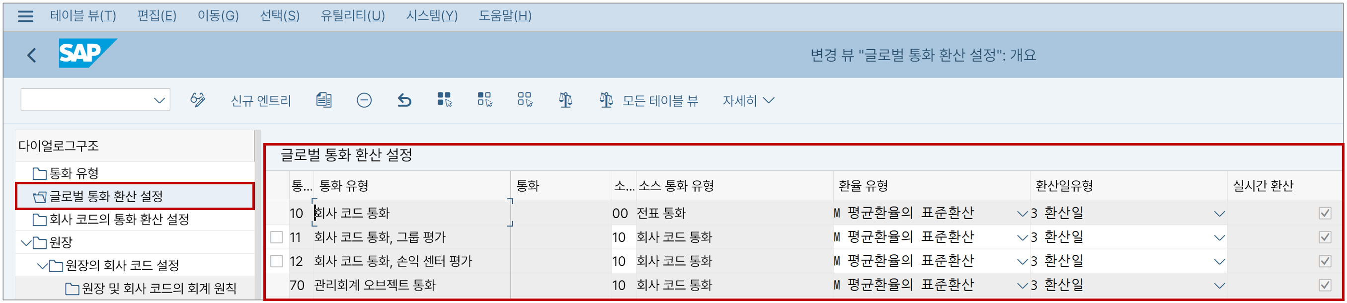통화 환산을 '글로벌(모든 회사코드에 공통으로 적용)'이나 '회사코드별(특정 회사코드마다 다르게 적용)'로 설정할 수 있다. 위 그림은 글로벌 설정인데, 전표통화(00)로부터 회사코드통화(10)를 어떤 식으로 환산할지가 지정되어 있다.