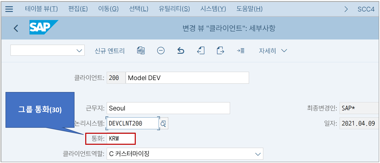 위 그림처럼 SAP에 로그인할 때는 이렇게 클라이언트 단위로 접속한다. 그룹 통화는 한 번 로그인한 시스템 내에서 공통으로 쓰는 통화라고 보면 된다.