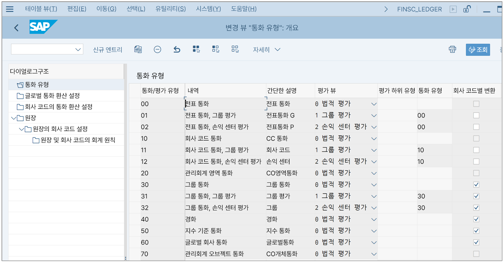 먼저 통화유형부터 더 들어가서 살펴보자. 우선 SAP 표준에서 관리하는 통화유형 리스트를 보기 위해 T-CODE: FINSC_LEGER에 들어가서 상단의 '통화 유형' 화면을 보자.