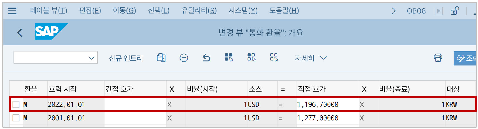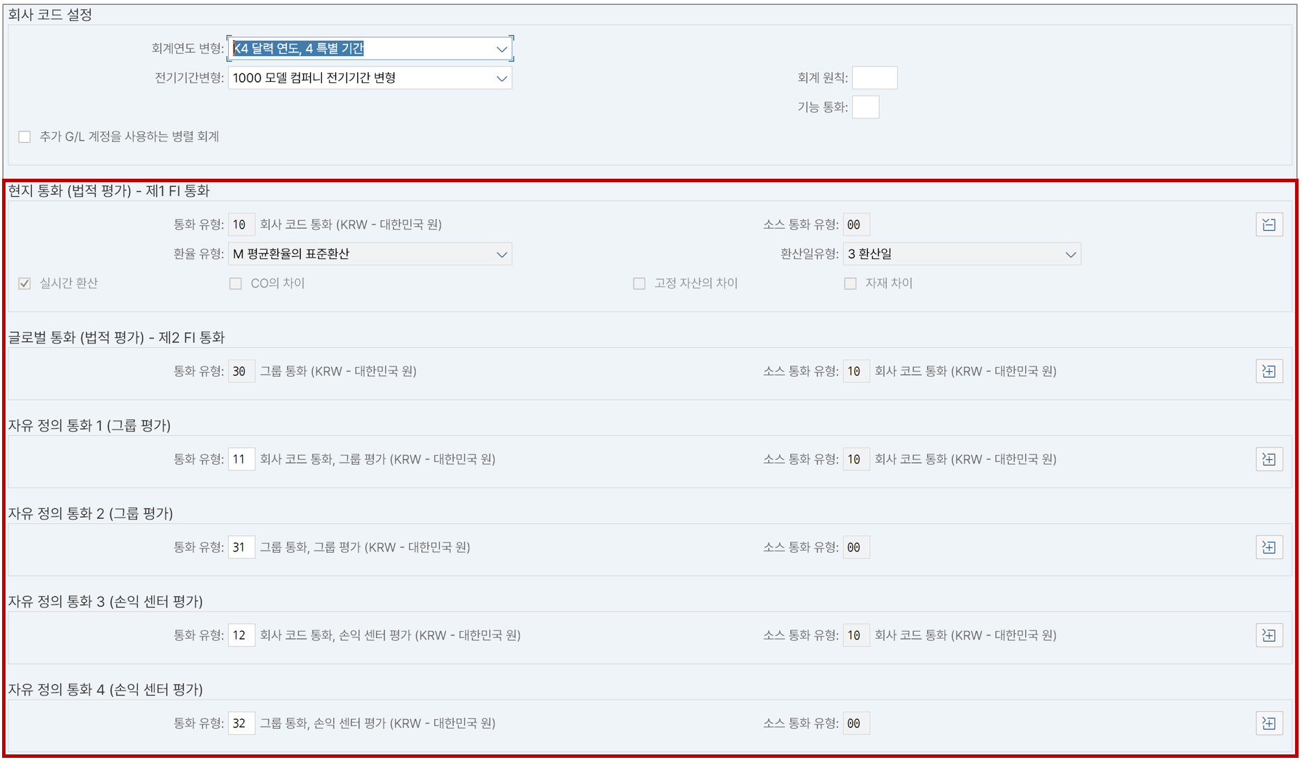 더블 클릭해서 보면 선택한 회사코드의 통화 관련 세팅이 어떻게 되는지 볼 수 있다. 여기서는 아까 설정한 통화 환산 설정도 함께 표현된다.