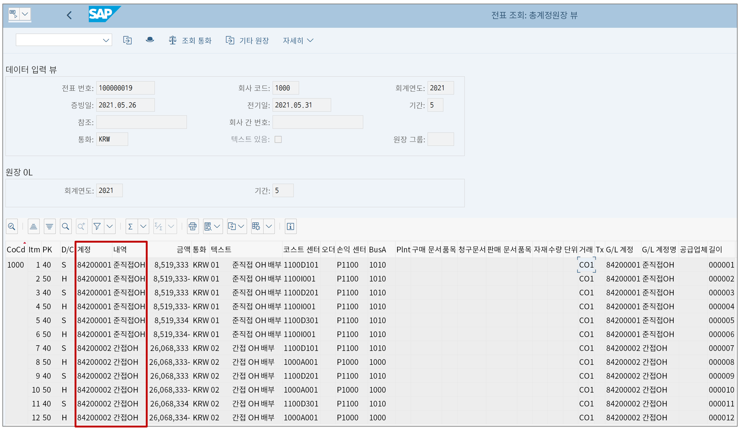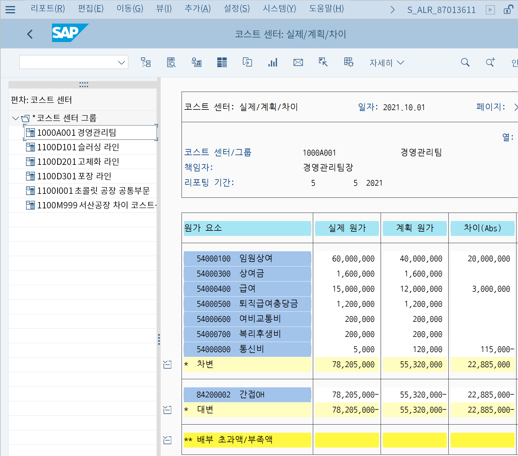 이것들은 다 SAP의 마스터 데이터로 실제 시스템에 존재한다. 전표 입력 시 Controlling Object 중 하나를 입력하면, 그 단위로 집계된 원가요소 데이터를 확인할 수 있다.