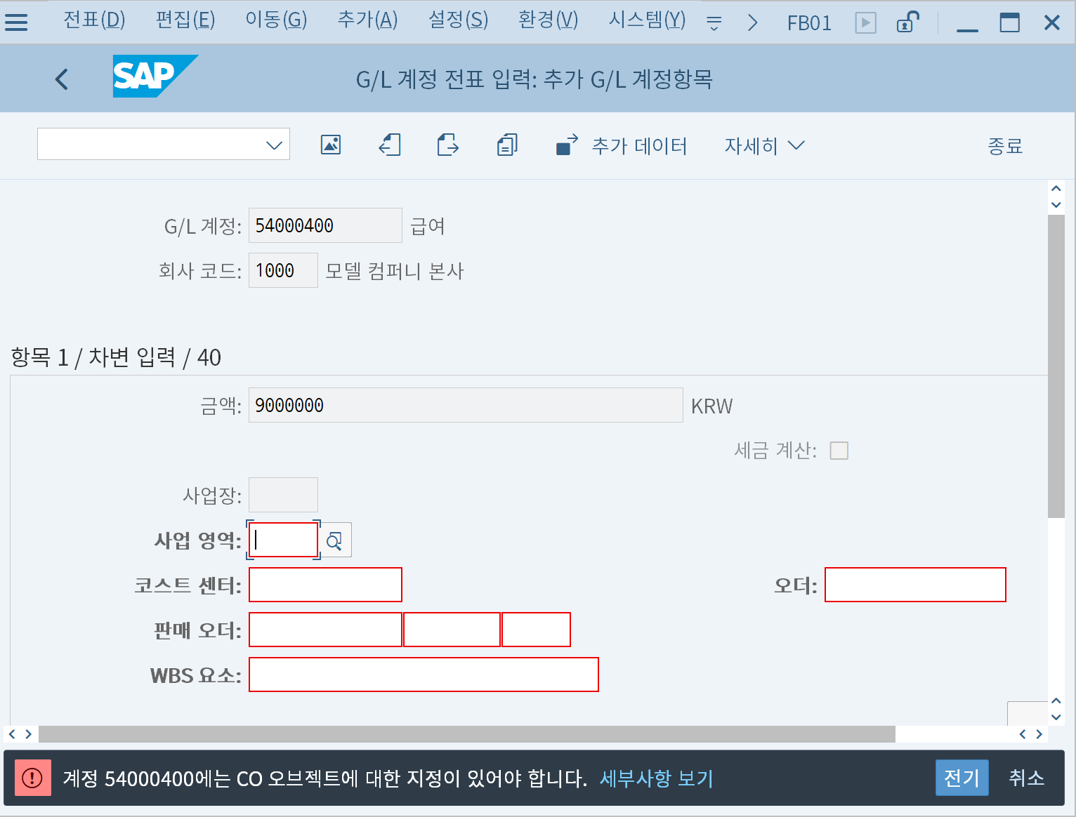 위 화면에서 보이는 8번대 계정은 2차 원가요소로 세팅된 계정으로, 과거에 FI 전표에서는 나타나지 않던 항목이다.