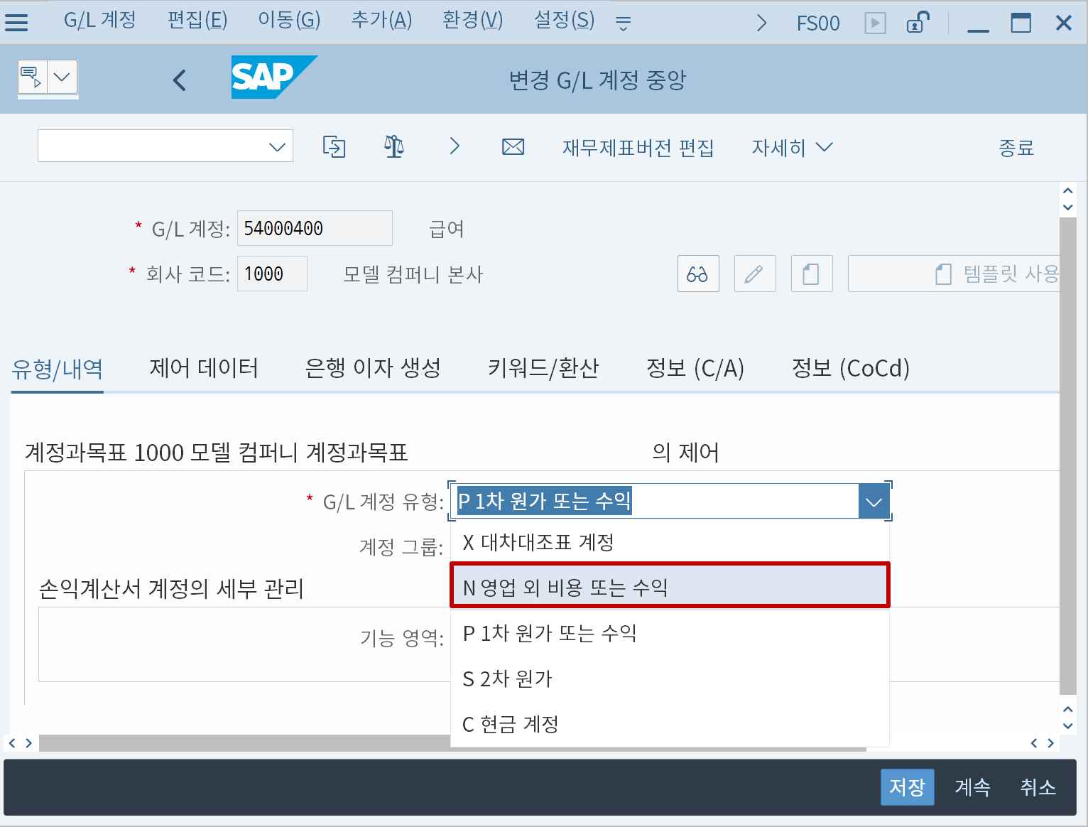 원가요소가 아닌 수익/비용 계정을 따로 관리할 수 있으며, 계정유형 "N"을 선택해주면 된다. 이 경우의 수익/비용 계정은 원가요소가 아니며, 따라서 아래 설명할 원가요소의 특징도 갖지 않는다.
