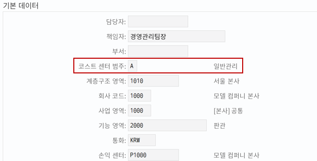 - (기능 외적으로는) 범주에 따라 해당 코스트센터의 용도를 구분한다. 이 경우는 기능적인 변화는 없고 단지 의미상 구분코드로만 사용할 뿐이다.