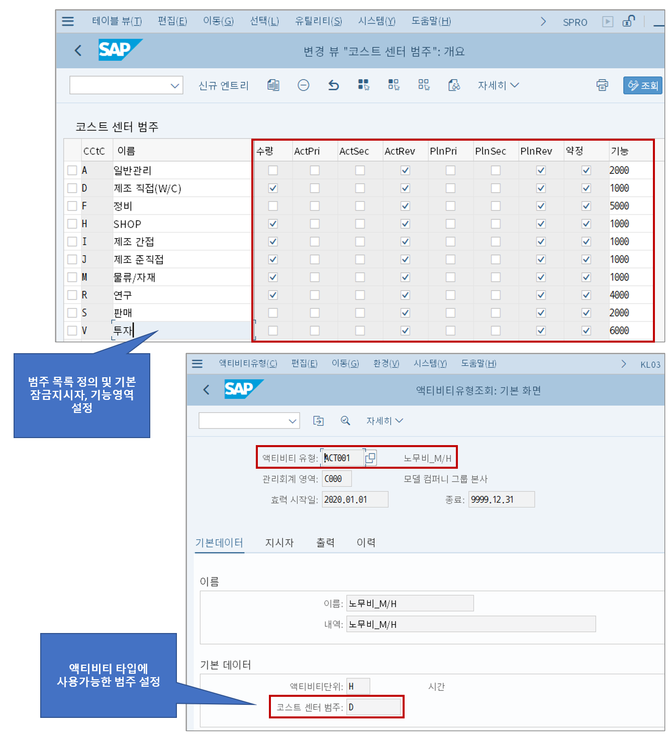 위 그림에서 보는 것처럼 범주에 따라 코스트센터 마스터의 잠금 지시자, 기능영역의 기본값을 설정할 수 있고, 액티비티 타입 마스터에서는 해당 액티비티가 입력될 수 있는 코스트센터의 범위를 제한하는 데 쓴다.