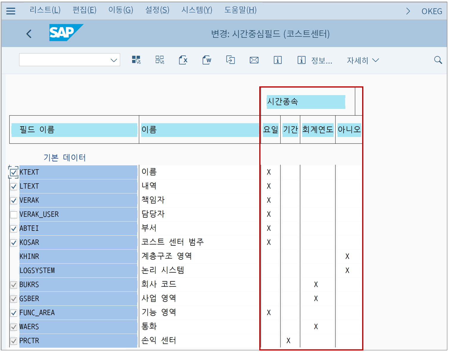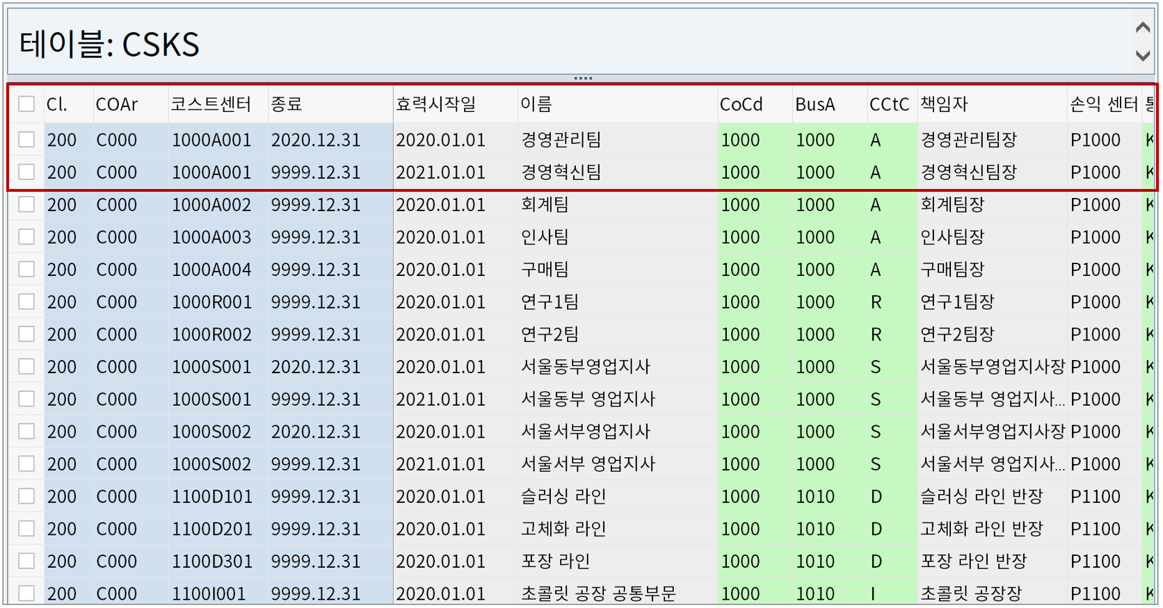 위 그림에서 코스트센터 '1000A001'은 2020년까지는 경영관리팀이었다가 2021년부터는 경영혁신팀으로 이름이 바뀌었다. 이런 단순한 텍스트뿐만 아니라 다른 필드도 변경이 가능한데,
