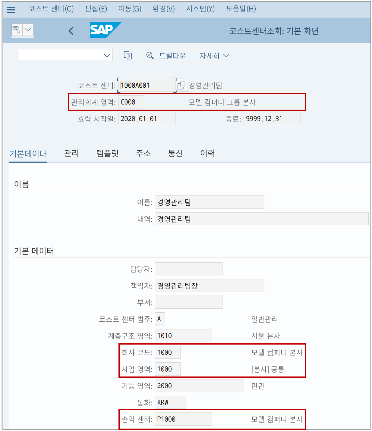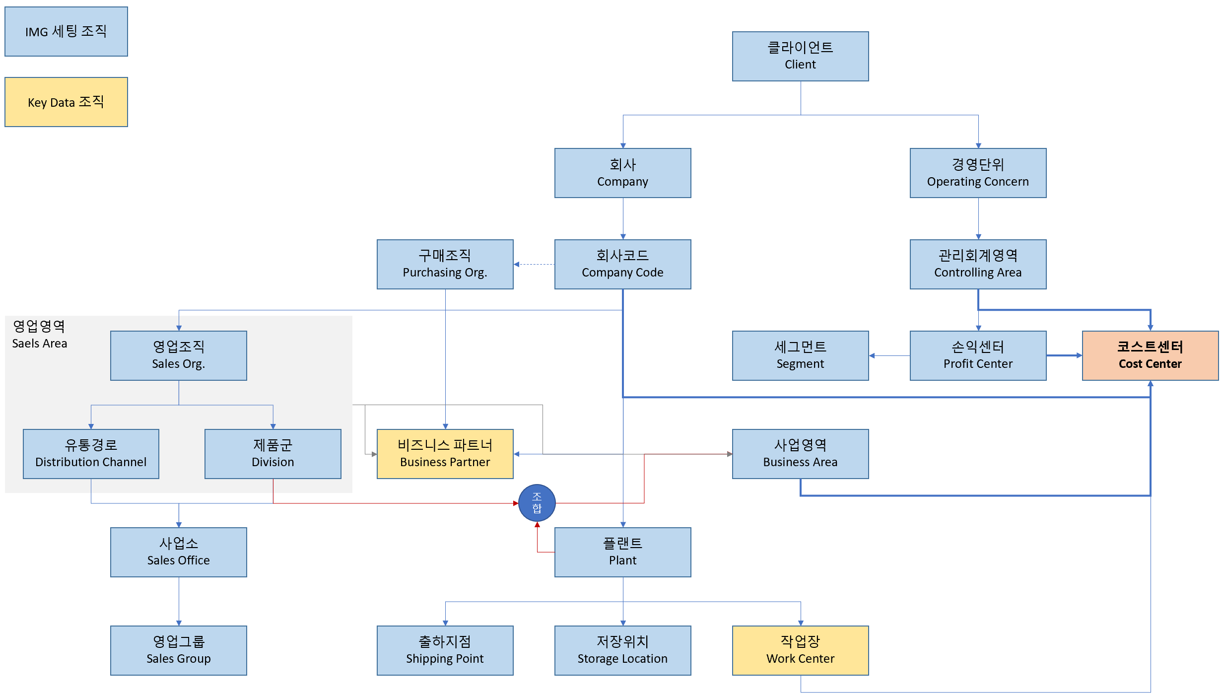 - 타 조직단위(회사코드, 손익센터 등)와 연결관계가 있다.