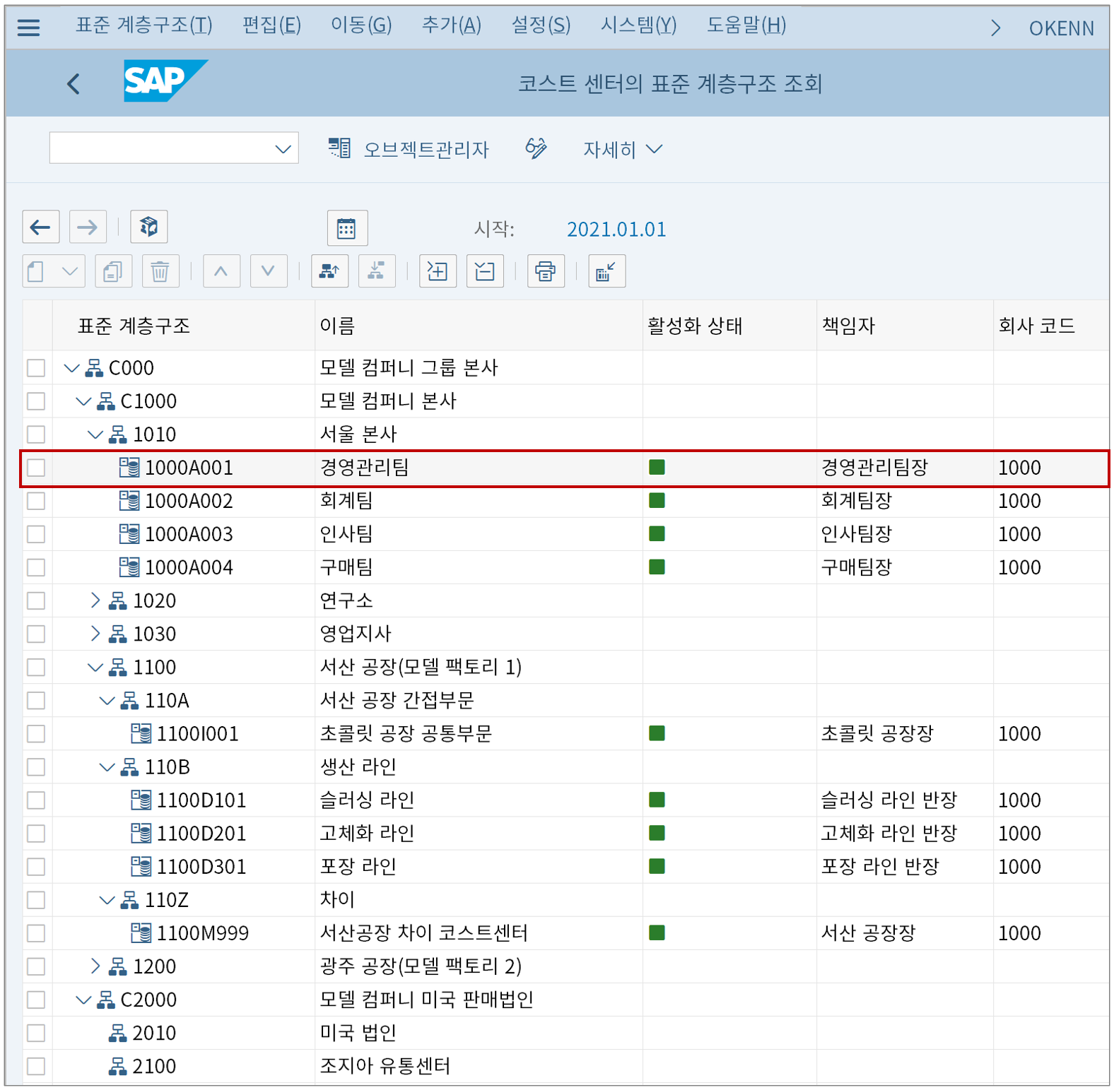 위 그림에서 보면 경영관리팀 코스트센터는 서울 본사(1010)라는 계층구조그룹에 소속되어 있다. 같은 그룹 내에 소속된 코스트센터로는 회계팀, 인사팀, 구매팀이 있다.