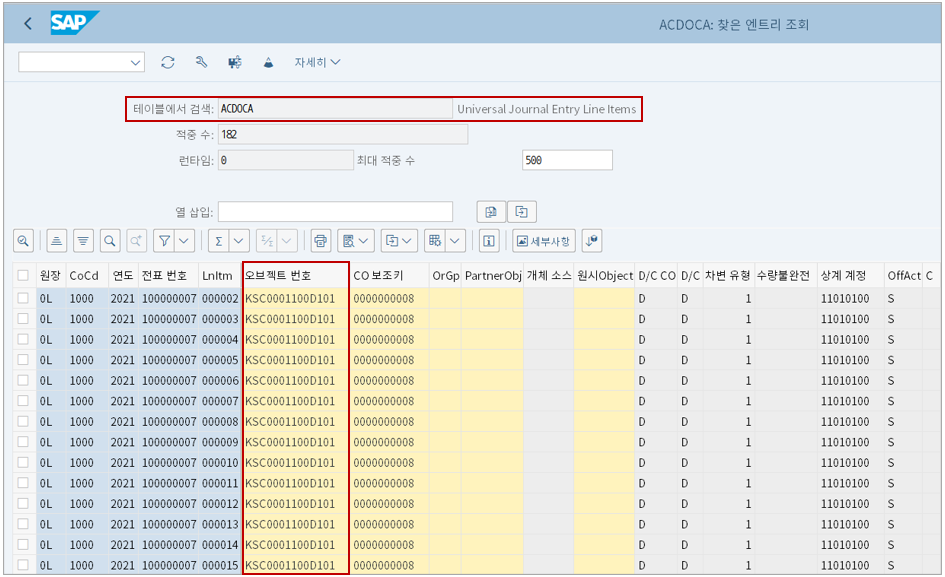 위 화면을 보면 ACDOCA에도 '오브젝트 번호'라는 필드가 있다. S/4HANA부터는 CO 데이터도 통합원장에 저장된다. 사실 아까 COSP는 ACDOCA의 VIEW이므로 실제로 저장되는 테이블은 아니다. 실제 데이터는 ACDOCA에 저장된다.