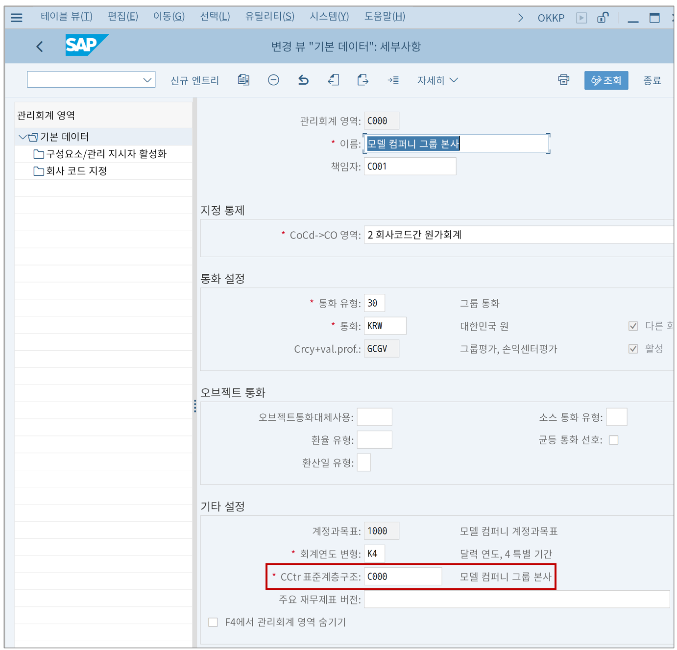 최상위 계층구조는 '모델 컴퍼니 그룹 본사(C000)'인데 이는 관리회계영역과 매핑되어 관리한다.