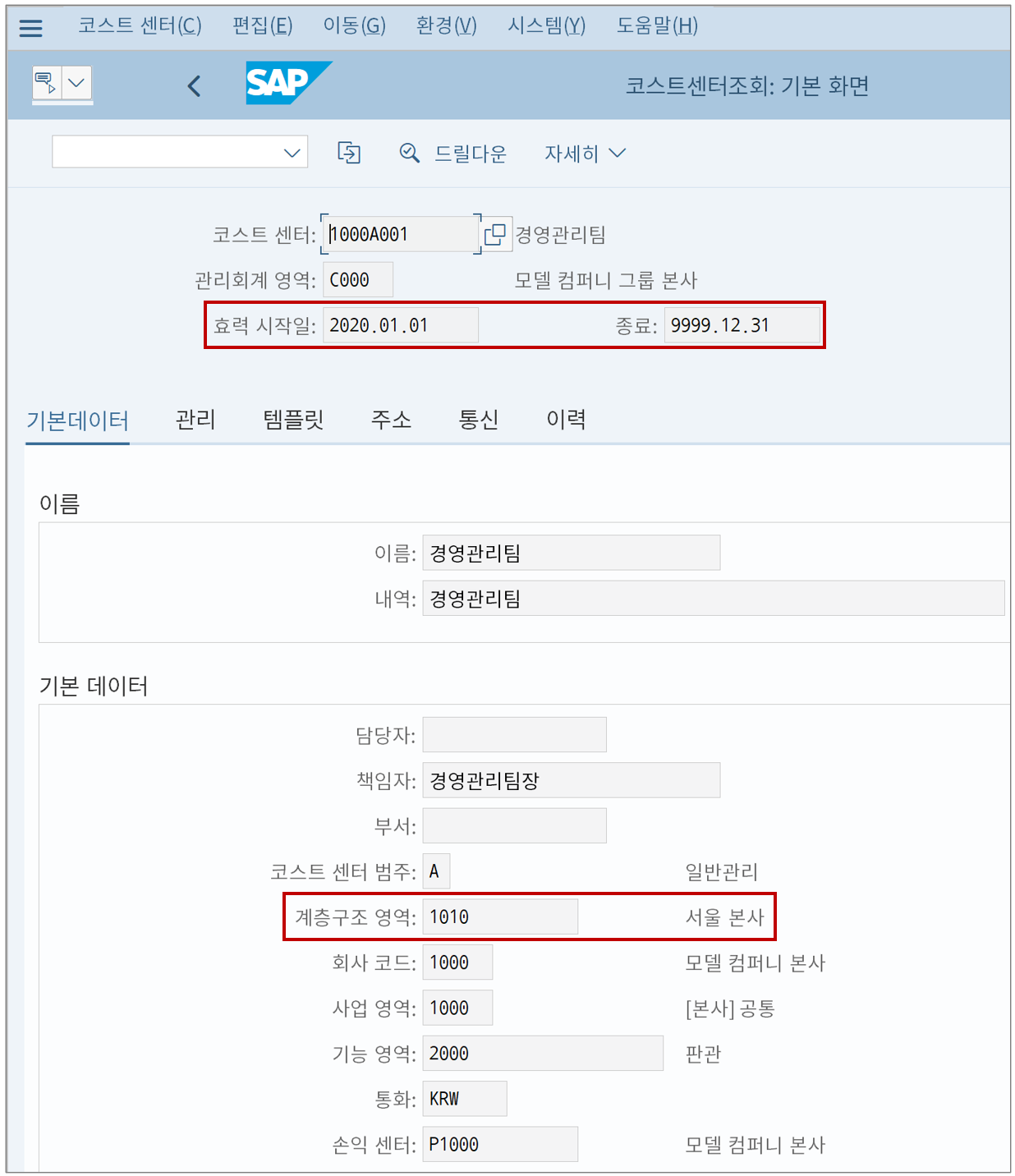 이런 식으로 조직도와 유사한 형태로 구성하므로 조직개편이 일어나면 코스트센터 구조 또한 변할 수밖에 없다. 따라서 기간 관리 기능을 제공하는데, 위 그림에서 "효력 시작일~종료일"이란 필드로 관리한다. 효력 종료일에 도달한 코스트센터에는 더 이상 비용을 집계할 수 없게 된다. 또는 동일한 코드의 코스트센터라 하더라도 효력일자에 따라 다른 설정을 반영할 수 있다. 예를 들어 2020년까지는 경영관리팀이었다가 21년부터는 경영혁신팀이란 이름으로 바뀐다면?
