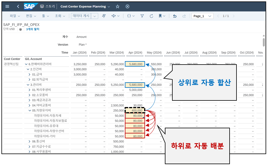 코스트센터나 계정에 있어서 하이어라키 구조만 세팅해두면, 입력할 때 자동으로 상위나 하위로 합산하거나 배분하는 기능이 있다. 별거는 아니지만 확실히 엑셀에서 수식으로 입력하는 것보다는 편한 부분이 있을 것 같다.
