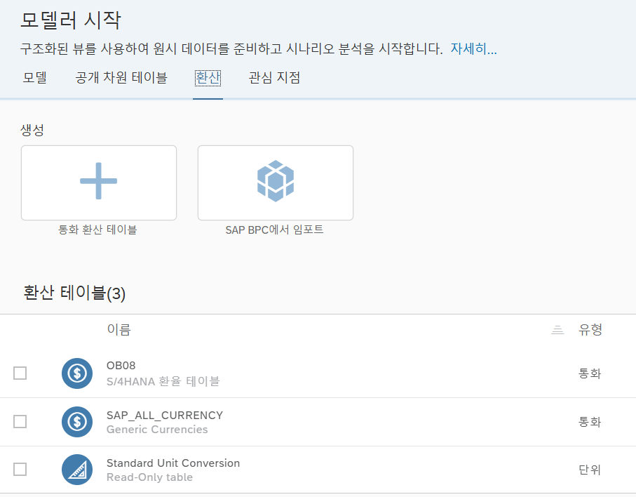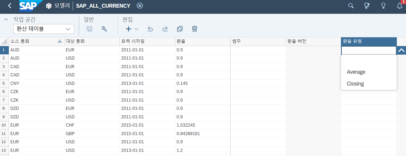 환율 테이블은 위와 같이 생겼다. '범주'에 해당하는 부분에서 ERP의 환율 타입처럼 계획용이니, 예산용이니, 실적용이니 등을 설정할 수 있다. SAC에서의 환율 유형은 해당 환율이 평균환율인지 마감환율인지 여부이다.