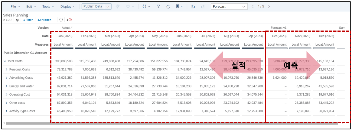 특정 버전에 저장한 예측 데이터를 활용해 실적과 비교하거나, 특정 기간 이전까지는 실적, 특정 기간 이후로는 예측 데이터를 보여주는 등 활용할 수 있다.