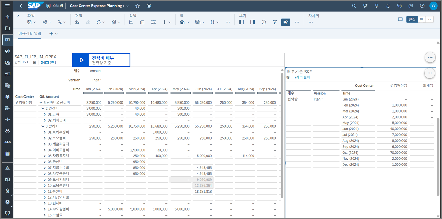 위 화면은 전력비를 전력량 SKF로 배부할 때 SKF 값과 비용계획 화면을 한 눈에 볼 수 있도록 (시뮬레이션도 해볼 수 있도록) 그려본 것이다. 이를 통해 SKF의 변화량에 따라 실제 비용이 어떻게 달라지는지를 확인할 수 있다.