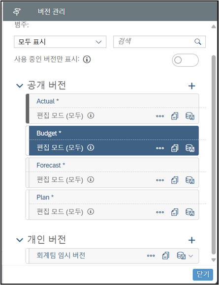 SAC에서는 버전을 공용버전과 개인버전으로 구분하고, 개인버전은 본인의 아이디 외에는 다른 사람은 건드릴 수 없는 버전으로 쓸 수 있다. 개인버전에서 입력이 완료된 데이터를 공용버전으로 릴리즈하는 방식이다.