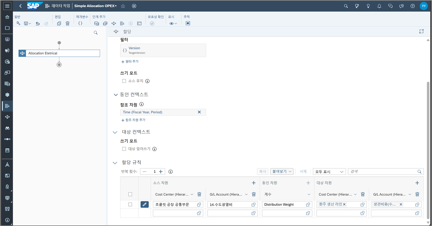 배부하거나 복사하는 기능도 쉽게 만들 수 있다. 센더/리시버/추적요인에 대한 세팅은 Assessment나 Distribution, Reposting, Indirect Activitiy Allocation 등 보다 훨씬 유연하고 직관적으로 만들 수 있다. 그냥 원하는 부분에 + 버튼을 눌러서 세팅하는 방식이다.
