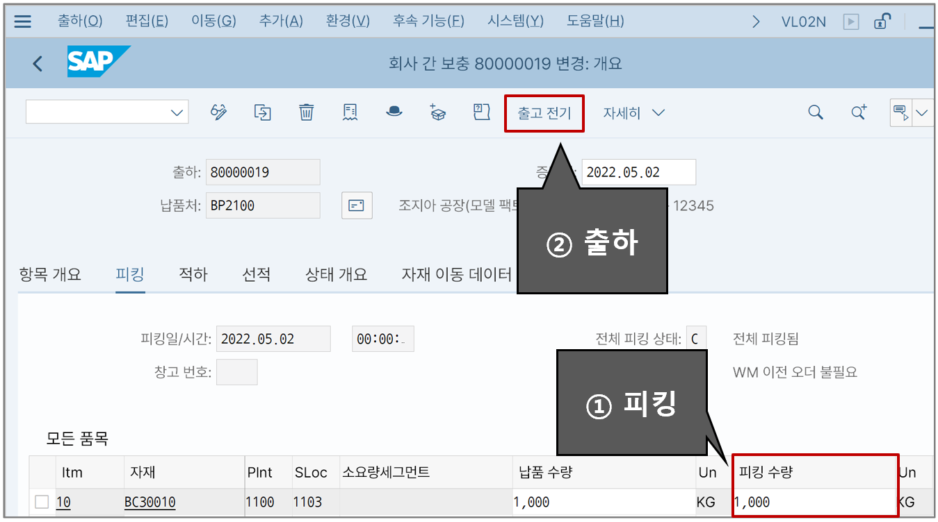 출하 문서에서 해당 반제품의 수량을 확인하고 피킹한다. 피킹 후 선적이 완료되면 시스템에서는 '출고 전기' 버튼을 눌러서 실제 출하를 진행한다.