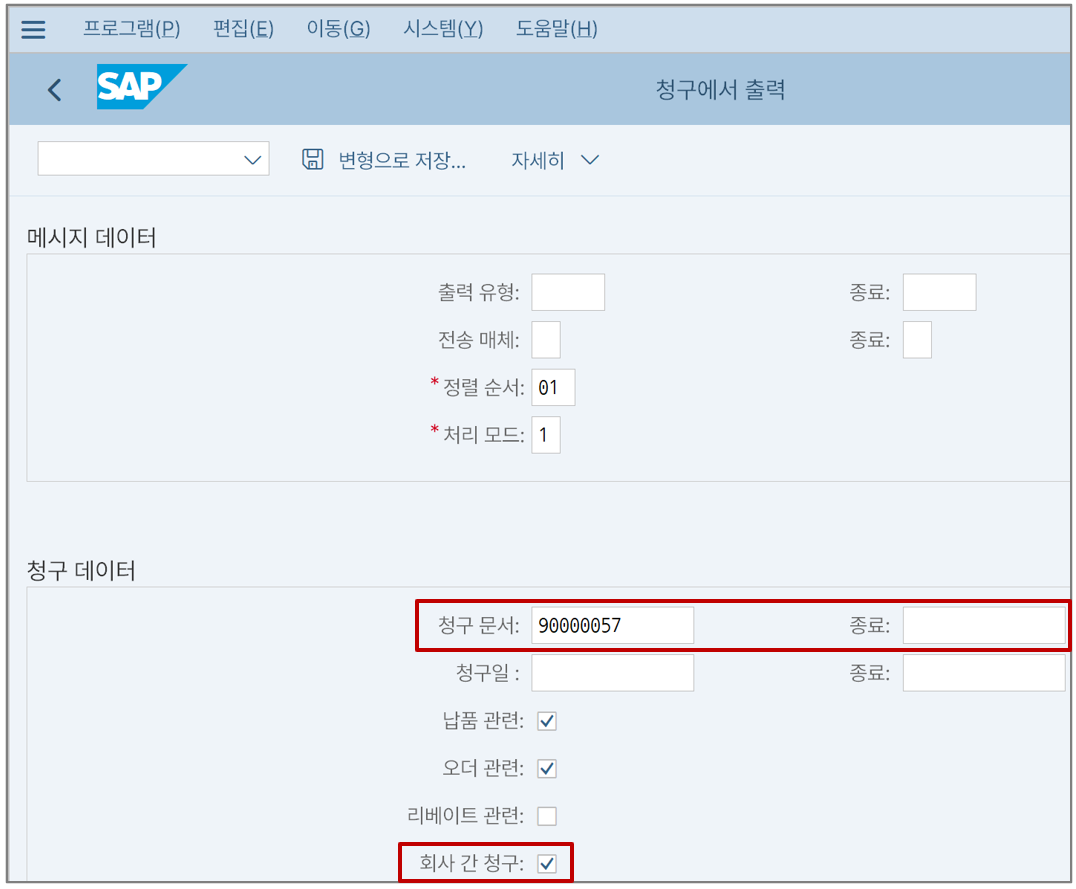 선택 조건에서 '회사 간 청구'를 선택하고, 빌링 문서를 조회해본다.