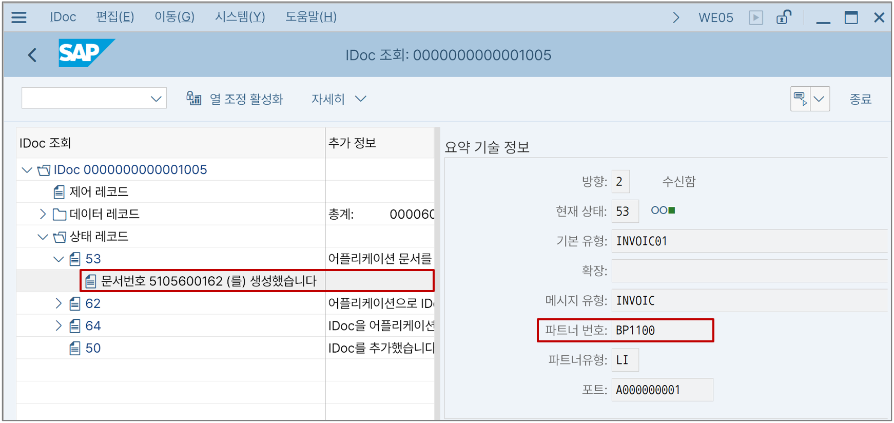 처리가 완료되면 T-CODE: WE05에서 결과를 모니터링해본다. 송장 문서가 생성됐음을 알 수 있다. (여기까지 오는데 수많은 시행착오를 겪게 된다...)