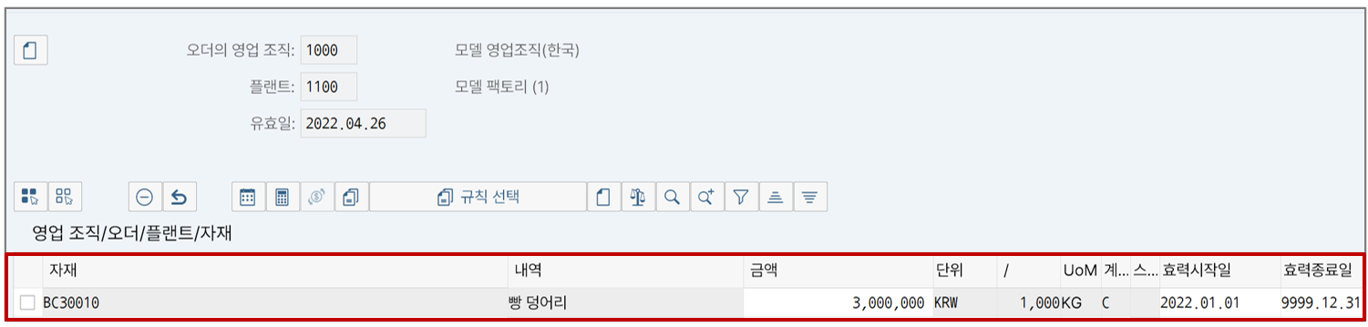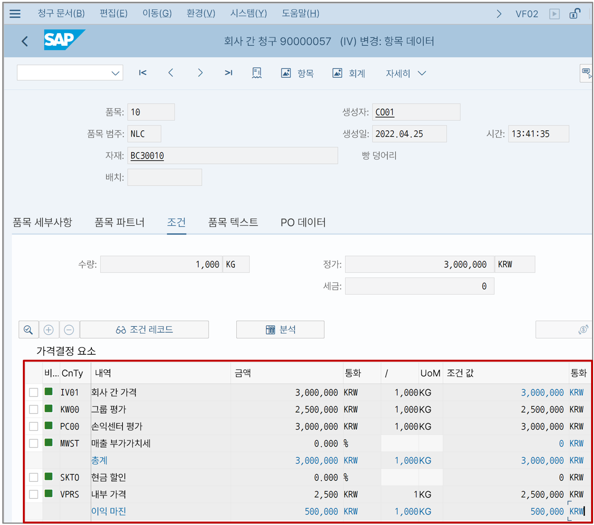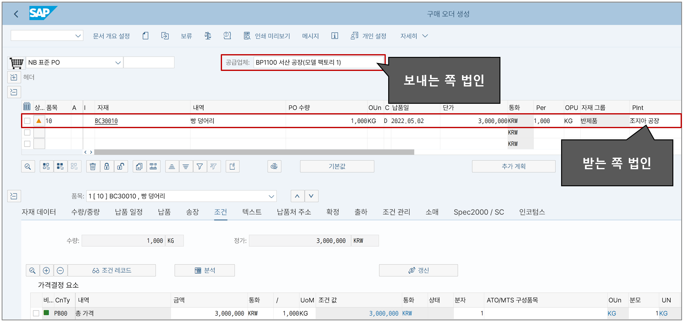 받는 쪽 법인 입장에서는 MM의 구매정보레코드, 보내는 쪽 법인 입장에서는 SD 조건 가격을 입력한다. 둘의 가격이 곧 법인간 내부이체가가 되며 우리 예시에서는 3,000,000원으로 동일하게 입력하자.