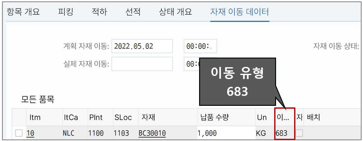 자재 이동 데이터를 보면 이동 유형이 '683'으로 지정되어 있다. 이는 우리가 지난 글의 세팅에서 T-CODE: VOV6에서 지정했던 납품일정라인 범주에서 가져오는 것이다.