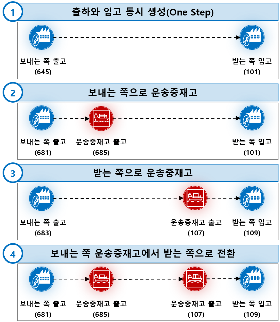1번 케이스는 보내는 쪽의 출고와 받는 쪽의 입고가 동시에 생성되는 방식이다. 2, 3, 4번 케이스는 모두 운송중재고가 있는 케이스다. 이 때는 인코텀즈에 따라 선적 시점에 해당 재고의 소유권이 보내는 쪽과 받는 쪽 어느 곳에 귀속되는지 처리가 달라진다.