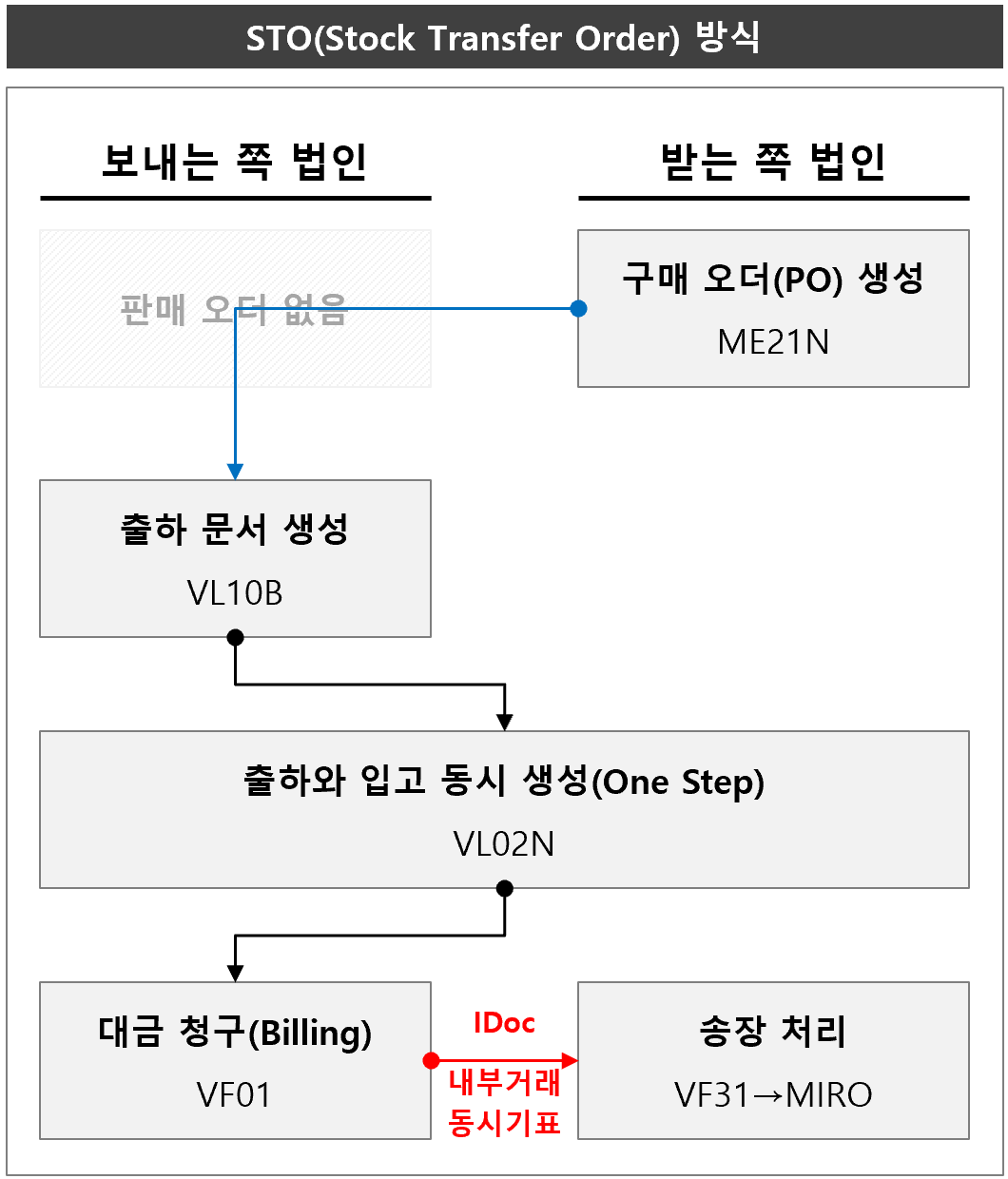 받는 쪽 법인에서 구매 오더를 생성하고, 이를 바탕으로 보내는 쪽 법인이 출하 문서를 생성한다. 출하 문서에서 출고 전기하면 시나리오에 따라 출하와 입고가 동시에 생성된다. 이 때 두 회사의 물류 전표와 회계 전표가 함께 기록된다. 이후 보내는 쪽 법인에서 빌링 처리를 하고, 그 문서를 근거로 하여 받는 쪽 법인의 송장 처리가 일어 난다.