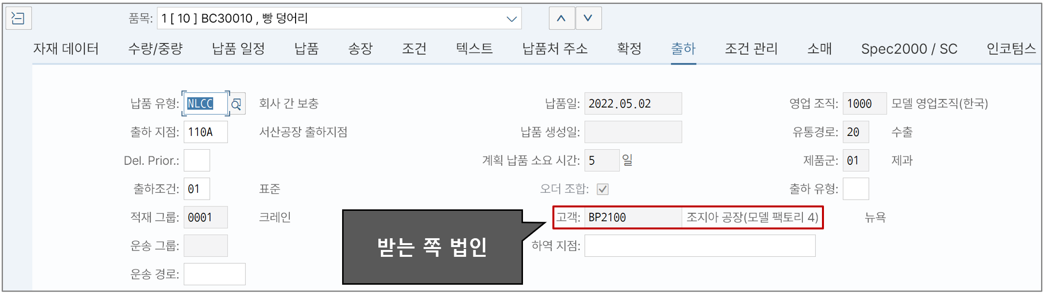 구매 오더의 '출하' 탭에 보면 판매 관련 정보가 기록되어 있다. 이 부분은 앞서서 미리 세팅을 해둔 덕분에 자동으로 끌고 온 것이다.
