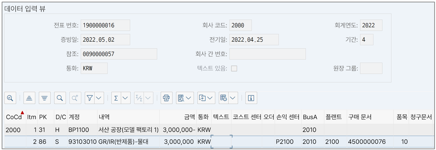 그룹 평가의 회계 전표를 보면 매출채권 마찬가지로 '대체 전기(CO로부터)'에 내부거래이윤인 500,000원만큼의 금액이 생긴다. GR/IR도 2,500,000원만큼으로 줄어서 표시된다.
